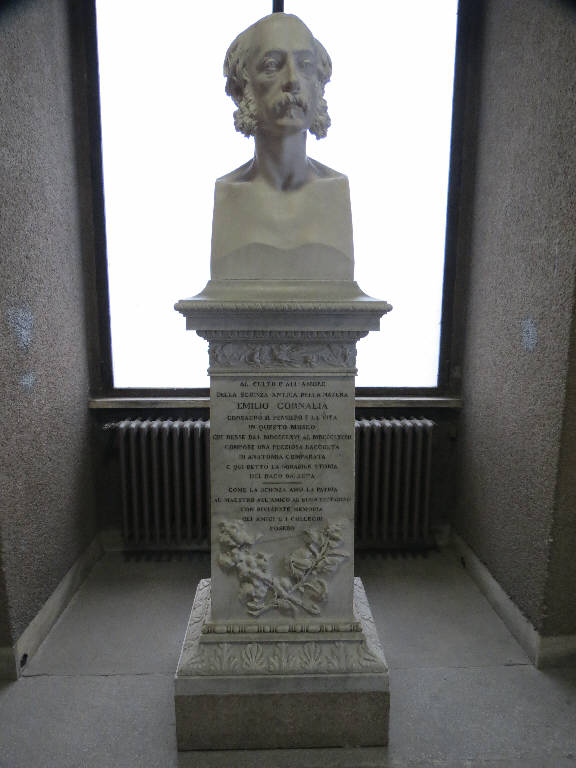 - NOTIZIE STORICO CRITICHE Emilio Cornalia (Milano, 25 agosto 1824 - 8 giugno 1882) nasce dal barone Francesco Cornalia, prefetto del Tronto e del Serio e amministratore dei Luoghi pii elemosinieri di Milano, e dalla nobile Luigia Kramer, sorella del chimico Antonio Kramer. Nel 1842 si iscrive alla facoltà di medicina a Pavia, interessandosi inizialmente alla mineralogia e alla geologia, per poi indirizzarsi verso la biologia, la zoologia, le analisi microscopiche e l'anatomia comparata. Nel 1848 partecipa ai moti rivoluzionari. Vince un concorso indetto dal Regio Istituto Lombardo nel 1853, il cui tema era "esporre l'anatomica struttura del baco da seta nello stato di bruco, di crisalide e di farfalla, indicando la storia fisiologica de' suoi organi; e dare la storia ed i caratteri principali delle malattie del baco stesso". Le sue ricerche sul baco da seta raggiungono importanti risultati, utili anche all'industria della bachicoltura (la sua più famosa pubblicazione su questo argomento è la Monografia del Bombice del gelso del 1855). Tra le numerose cariche istituzionali, nel 1866 diviene direttore del Museo di Storia Naturale, dove già dal 1853 era assistente alla Direzione. Promuove lo sviluppo di tutte le collezioni, specialmente di quella di anatomia comparata, e alla sua morte lascia al Museo la sua biblioteca scientifica.\nIl busto a ricordo di Cornalia viene realizzato grazie alla sottoscrizione promossa di Filippo Terzaghi (già suo allievo presso la Regia Scuola superiore di agricoltura), che raccoglie le offerte di numerosi donatori (2114 lire). Viene inaugurato venerdì 8 giugno 1883, con una commemorazione letta da Antonio Stoppani, successore alla direzione del Museo, e alla presenza delle autorità municipali. L'epigrafe riportata sul basamento del busto era stata dettata dal comm. senatore Giulio Carcano.\nSul basamento di appoggio al busto, sono raffigurati rami di gelso e bachi da seta, al cui studio Cornalia dedica molti anni della sua vita e per cui diventa noto.