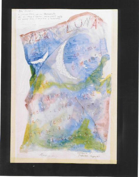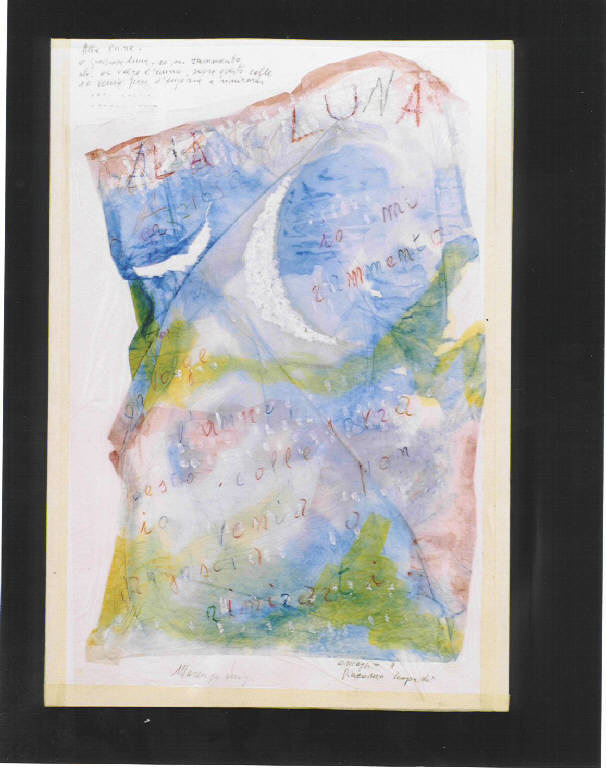 Opera che rappresenta uno spicchio di luna bianco immerso in macchie di colori diversi e parole tratte da Alla luna di G. Leopardi. Stesura variata su carta stroppicciata.