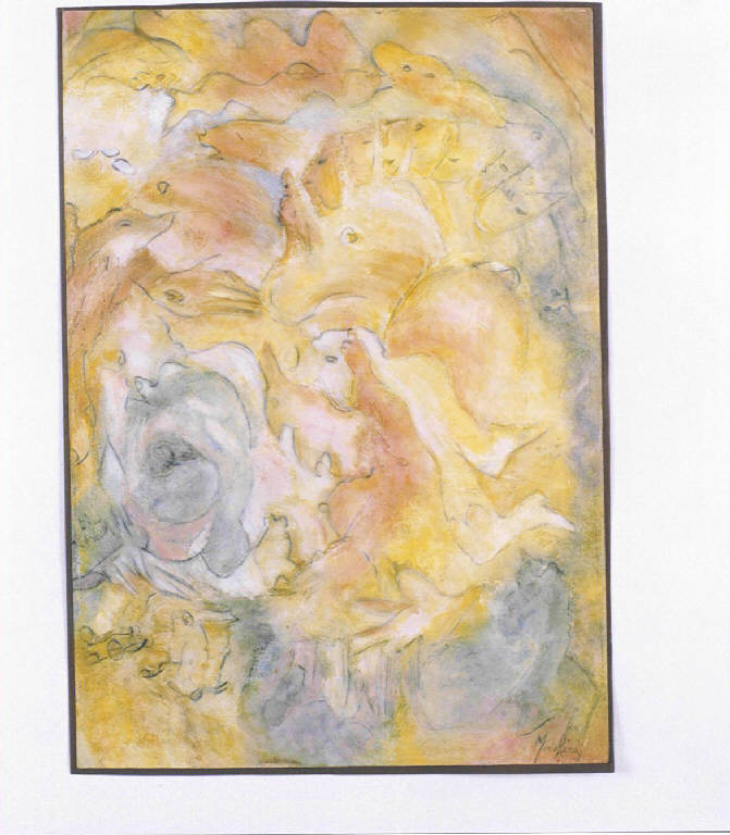Figure di persone e di animali mescolati l'una dentro l'altra in modo fluido.\nLinea fluida; colore caldo.