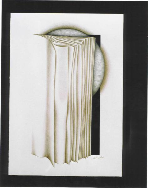 Opera che rappresenta pagine di un libro bianche, tra queste emerge sul fondo una luna tonda e bianca.