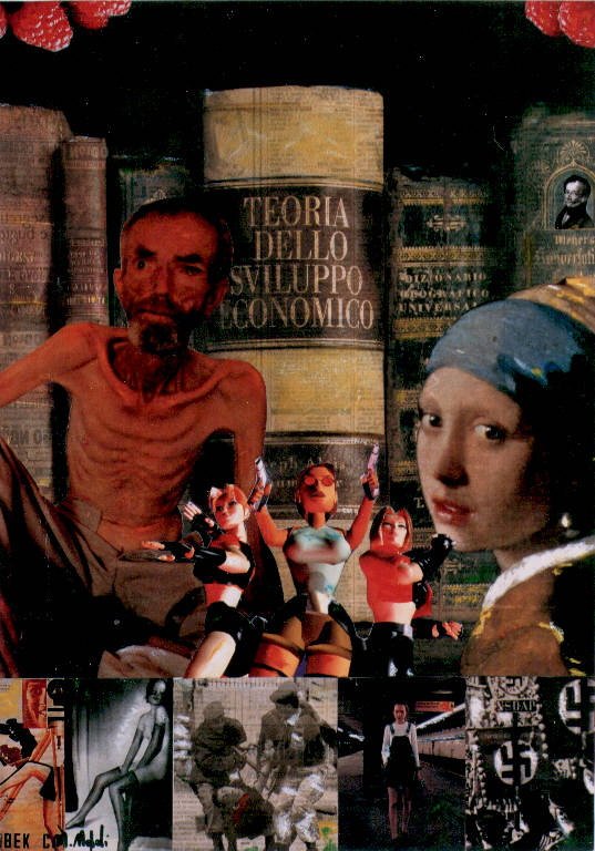 Opera costituita dal collage di varie figure tratte dal mondo dell'arte, dei video games, dai giornali. Sullo sfondo libri antichi tra cui Teoria dello sviluppo economico e Dizionario Geografico universale.