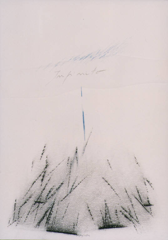 Opera che rappresenta, a tratti leggeri, un colle e il cielo; una linea verticale azzurra li congiunge. Nel cielo c'è scritto infinito.