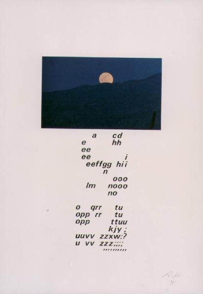 Opera costituita da una fotografia che rappresenta la luna piena dietro una collina. Al di sotto lettre sparse.