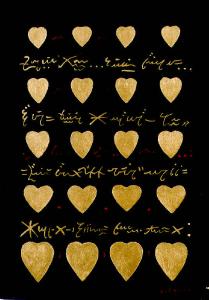 Opera cartterizzata da cuori di varie dimensioni disposti in file orrizzontali e segni arabi.