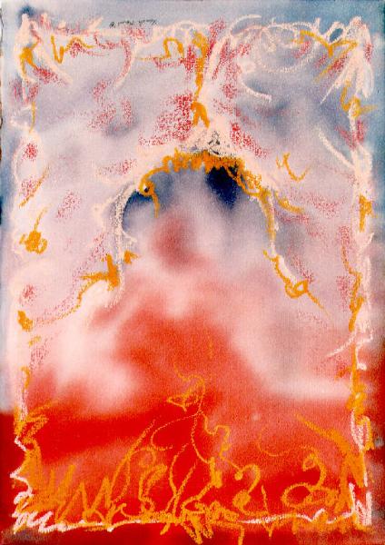 Opera caratterizzata da un fondo cromatico azzzurro e rosa e da segni rapidi e ondulati che creano una cornice con prolungamenti anche verso l'interno.