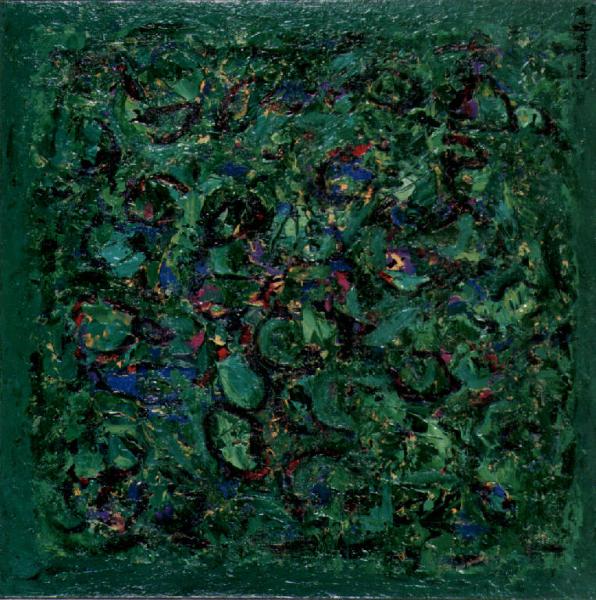 Opera caratterizzata da una materia pittorica grumosa e spessa che rappresenta fiori e piante.