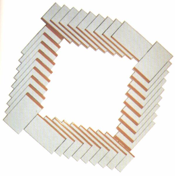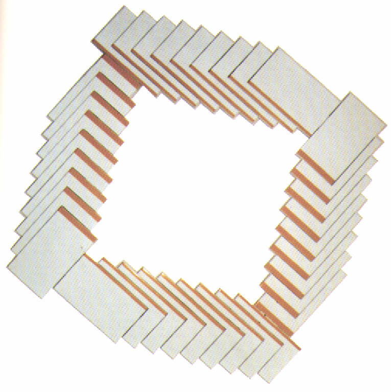 Opera in legno costituita dall'insieme di forme a L uguali e ripetibili che rendono frastagliato il contorno. Il centro è un quadrato cavo.