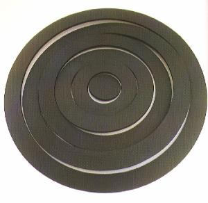 Opera in legno costituita da 5 cerchi di diametro differente componibili a piacere nello spazio. Toccati i cerchi ondeggiano crendo un moto vario.