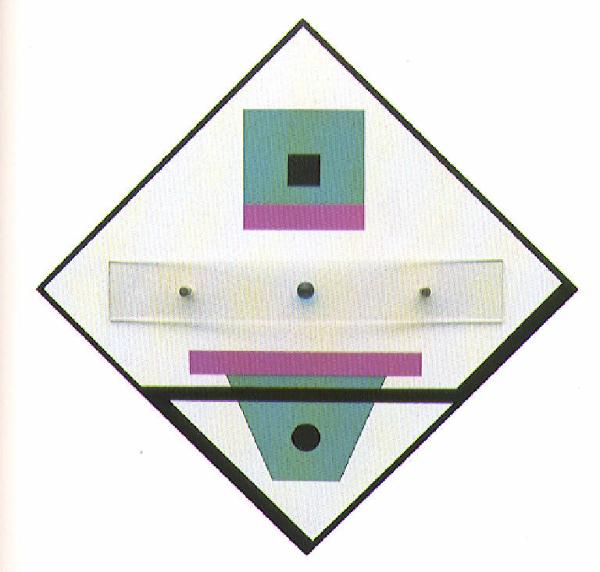 Opera polimaterica di forma quadrata a fondo bianco e forme geometriche colorate. Al centro è fissata una striscia in plexiglas trasparente sotto cui è posta una pallina bleu. L'opera è da fruire posizionando i vertici secondo i 4 punti cardinali.