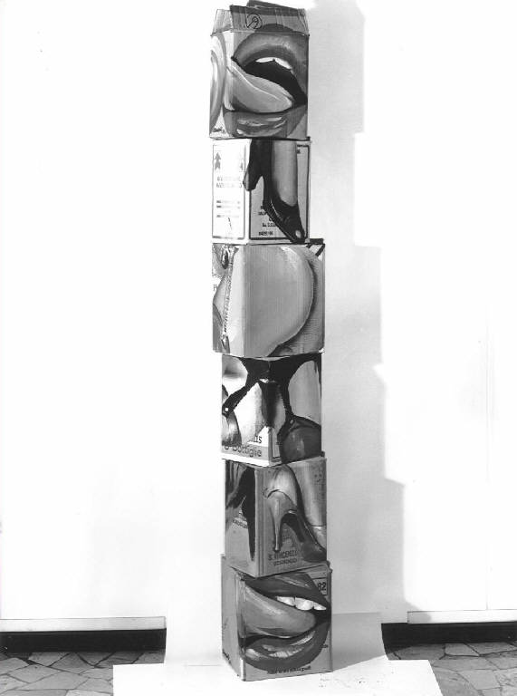 Composizione di sei scatole dipinte da ogni lato e sovrapposte una sull'altra. Sono rappresentate parti anatomiche femminili evidenziate nel loro messaggio sessuale.