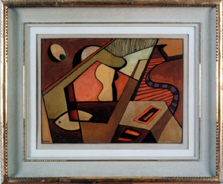 - NOTIZIE STORICO CRITICHE Quest'opera appartiene certamente al periodo nel quale l'artista aderì all'Astrattismo e al Concretismo italiano. Nel dipinto, infatti, il linguaggio astratto proprio di Radice si mescola a quello figurativo, tipico del periodo bellico. Nell'opera sono infatti riconoscibili alcune strutture architettoniche e alcuni elementi naturalistici, che riflettono il particolare momento creativo dell'artista.\nEmblematica è anche la presenza del pentagono, originato dall'incastro di figure poste apparentemente su piani differenti, che da origine al nome. In qualche modo quest'opera si collega ai dipinti di Radice eseguiti negli anni Quaranta, in cui l'artista si dedica alla pittura figurativa realizzando una serie di opere note come "Crolli", dai quali al termine della Guerra Radice si distacca, tornando alla produzione astratta.