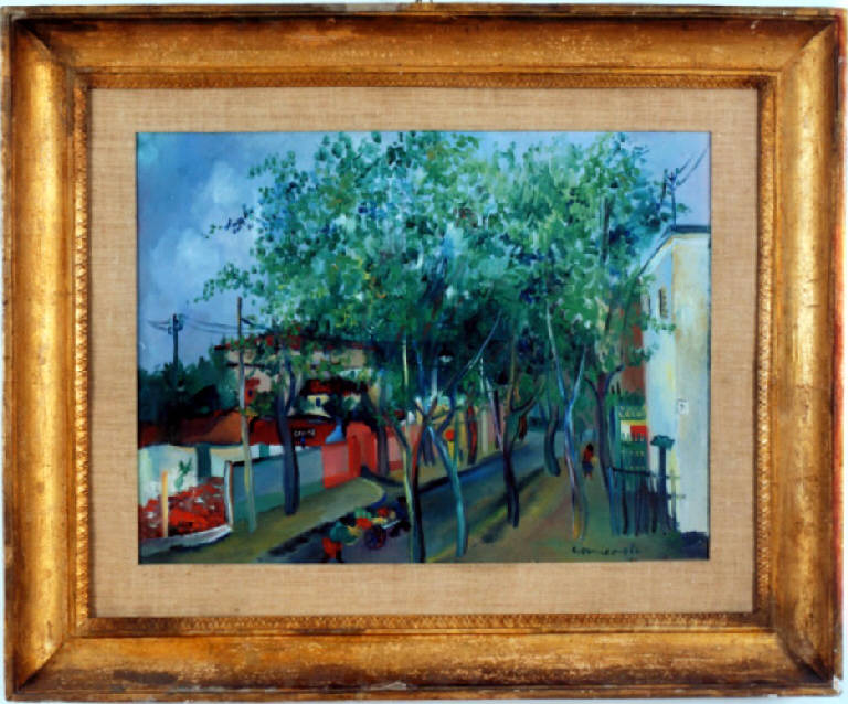 Strada a Ponte Milvio-Osteria in periferia. Paesaggio con alberi