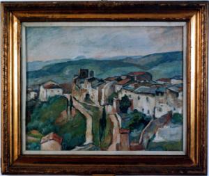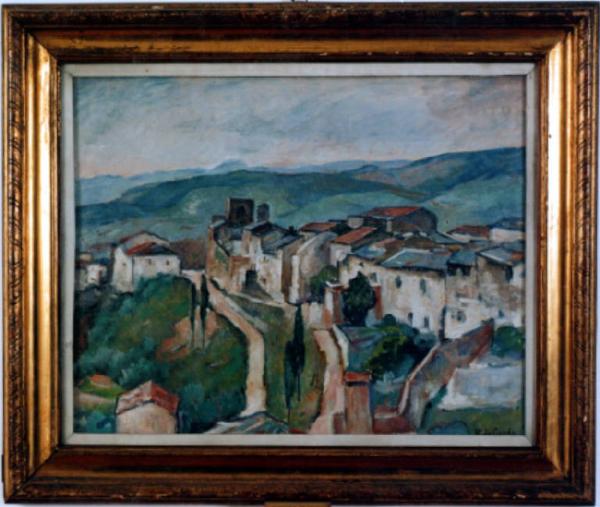 La tela, di forma quasi quadrata, è una veduta del borgo di San Gimignano con rappresentate all'orizzonte le suggestive colline toscane che in quest'opera si fondono con il cielo grazie al colore sfumato azzurrognolo. In primo piano l'artista inserisce le case del borgo che riduce a poche linee di base, fortemente impastate e fratte dal colore. Quest'ultimo, impiegato con tonalità calde e in maniera da valorrizzare le sfumature, gioca con una stesura pittorica del colore stratificato e steso con tratti veloci.