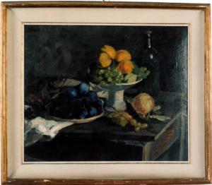 Opera pittotrica raffigurante una natura morta. La luce laterale illumina i frutti che si stagliano su fondo scuro. La stesura è irregolare e materica.
