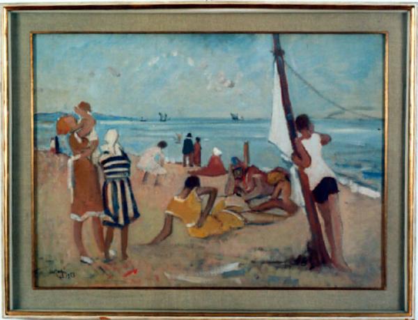 Opera pittorica che rappresenta una spiaggia affollata. La luce è chiara e diffusa. La stesura è irregolare, a macchia.