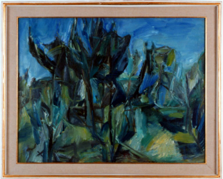 Opera pittorica che rappresenta alberi e cespugli ottenuti attravero un segno libero e colore. Il colore predominante è il verde. La stesura è veloce irregolare, energica e materica.