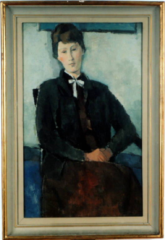 Opera pittorica che rappresenta una donna seduta. Il colore prevalente è il bruno del vestito e dei capelli, mentre lo sfondo è chiaro. La stesura è uniforme e densa. La luce è frontale e investe il personaggio.