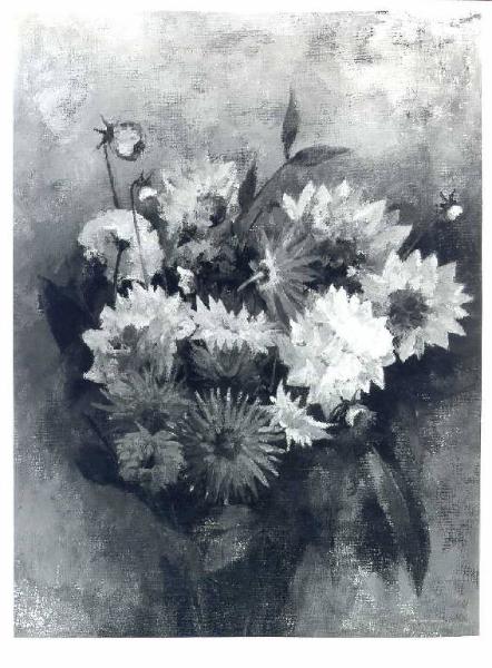 Opera pittorica che rappresenta un mazzo di fiori. I colori prevalenti sono il rosso, il rosa e il verde, per i fiori e azzurro per lo sfondo. La stesura è veloce e franta, a macchia per lo sfondo. La luce frontale illumina i fiori.