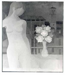 Opera pittorica che rappresenta un nudo femminile e un mazzo di fiori e sullo sfondo una città. La stesura è unitaria e materica e la luce è contrastata.