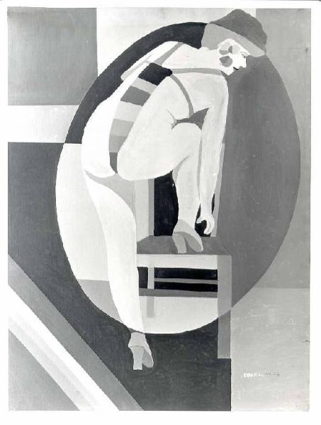 Opera pittorica che rappresenta una donna inserita in uno sfondo di forme geometriche. Il colore è freddo e piatto, la luce è diffusa. La stesura è compatta e unitaria.