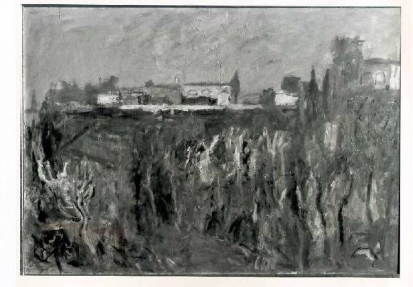 Opera pittorica che rappresenta in primo piano alberi e cespugli ottenuti con un segno veloce e riassuntivo; in secondo piano in cima ad una collina, un paese e una piccola pieve con campanile. La stesura è nervosa e a macchia. La luce è uniforme.