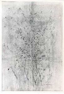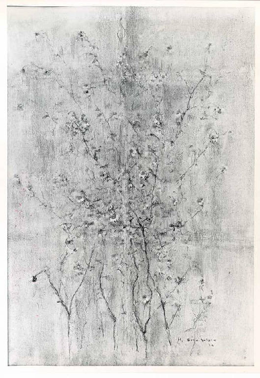 Opera pittorica che raffigura al centro rami in fiore dipinti con un segno sottile e una meteria veloce e frammentata. La stesura è macchia.