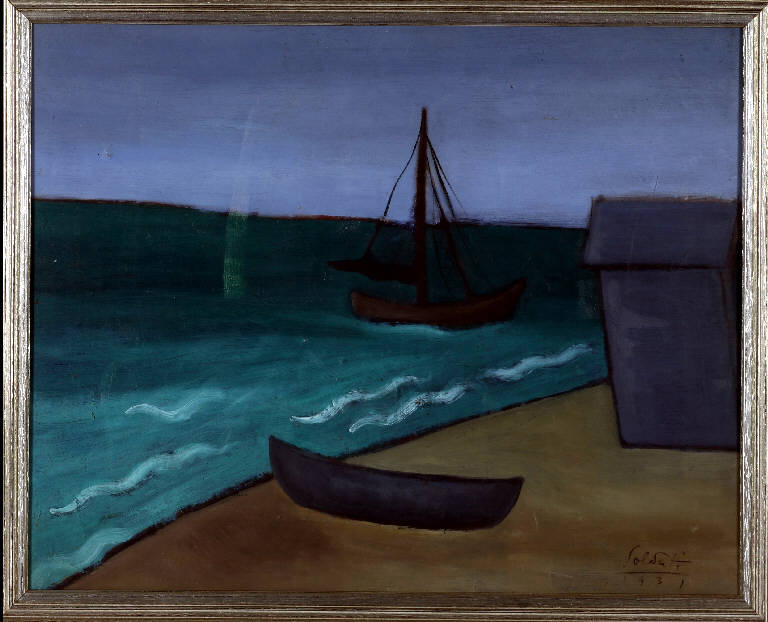 Opera pittorica con in primo piano una barca e una cabina sulla spiaggia. In secondo piano una barca a vela galleggia vicino alla riva.\nIl colore è tonale; freddo (viola, azzurro, grigio); sfumato.\nLa stesura è stratificata, uniforme e piatta. La luce è contrastata.