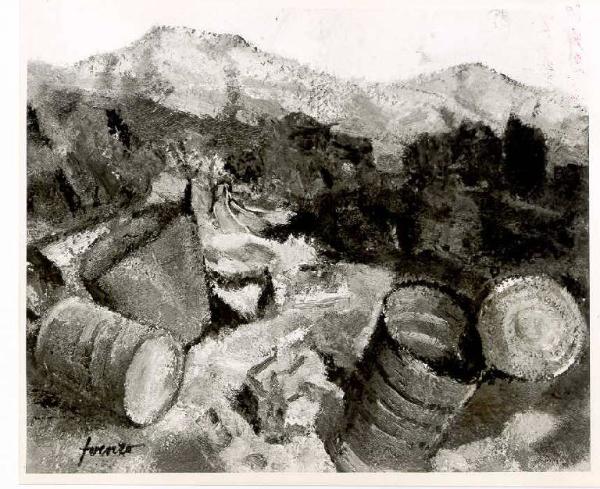 Opera pittorica che rappresenta un ampio paesaggio di montagna. In primo piano sono collocati alcuni barattoli aperti di latta arrugginita; in secondo piano si apre il paesaggio di montagna. Il colore è tonale; caldo; sfumato. La stesura è nervosa e spessa. La luce è laterale.
