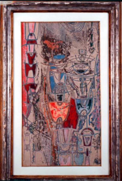 Opera pittorica in cui in uno spazio compositivo privo di profondità si dispongono secondo direttrici verticali e parallele segni-scrittura di dimensioni diverse e segni-pupazzi arcaici. Il colore è grigio sullo sfondo e rosso e blu in alcune zone. Stesura: veloce; frammentata. Struttura: dinamica.