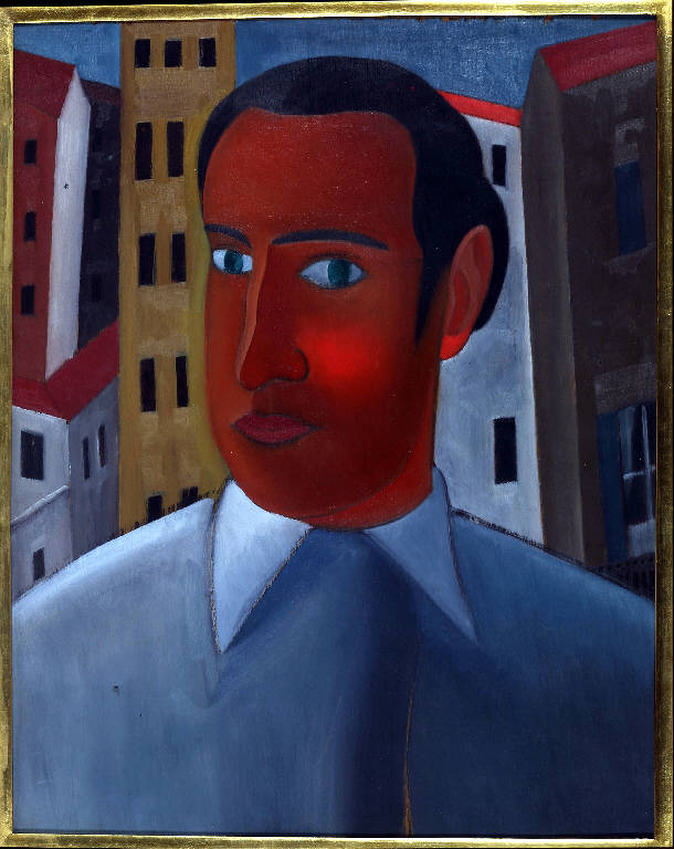 In primo piano Soldati si ritrae con le spalle frontali, la testa leggermente voltata a sinistra e lo sguardo rivolto verso lo spettatore. Le forme sono sintetiche e geometrizzate. In secondo piano i palazzi di una città sono trasformati in parallelepipedi addossati gli uni agli altri senza prospettiva. Il colore è sfumato; tonale; freddo (azzurro); caldo (bruni) e la stesura è uniforme. La Luce è contrastata.