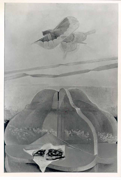 Opera pittorica che rappresente in primo piano una struttura tridimensionale arancio come una tenda da circo, in alto volano alcuni acquiloni.\nIl colore è azzurro, arancio, rosa. La stesura è densa e irregolare.