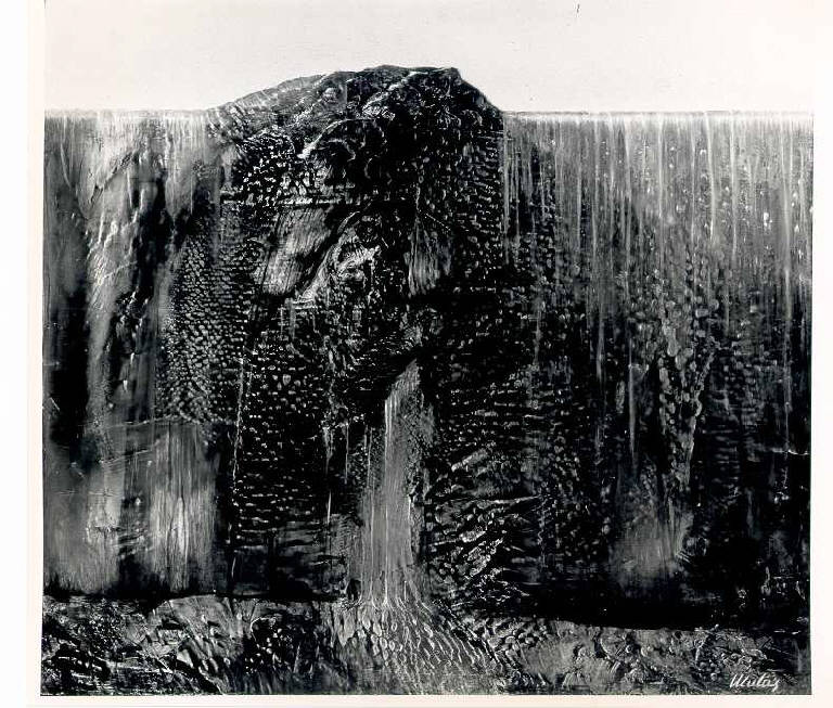 Opera pittorica che rappresenta in primo piano una grande montagna in parte rocciosa e in parte verdeggiante al centro della quale si apre una piccola cascata. Altra acqua scende lungo tutta sommità della montagna. In alto il dipinto si conclude con una stretta fascia di cielo. La stesura è irregolare e materica. La luce è contrastata.