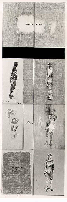 Opera pittorica in cui il campo compositivo, composto da tre pannelli separati, è diviso in rettangoli affiancati due a due. All'interno degli spazi rettangolari sono collocati, alternativamente, scritte e figure femminili appena accennate. Dall'alto: "inganno e realtà", due figure femminili di profilo e una di trequarti; due rose e la scritta "con sentimento"; la modella di spalle; la scritta "la modella è la pittura"; la modella vista frontalmente.\nLa struttura è statica e simmetrica. La stesura è sottile. La luce è contrastata.