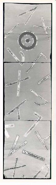 Opera pittorica caratterizzata da segni-scrittura in foglia d'oro, chiusi e geometrici (x, y, o, v, I) disposti secondo un ordine apparentemente casuale su fondo neutro. Il colore è cromatico; piatto (oro, azzurro). La stesura è spessa. La struttura è dinamica.