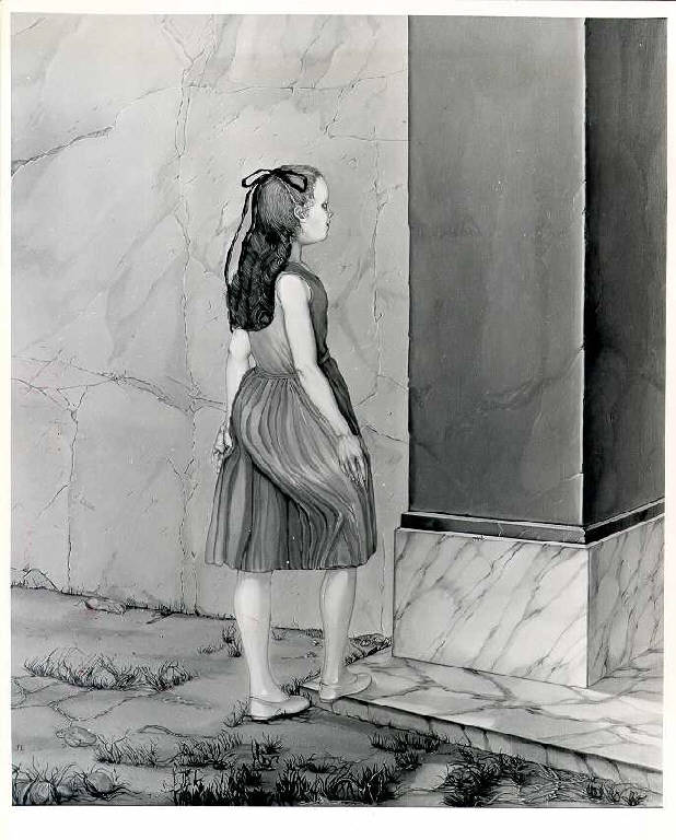 Opera pittorica che rappresenta in primo piano al centro una bambina in azzurro vista di spalle in atto di salire uno scalino. Nel piano di fondo vi sono un pilastro e un muro. La stesura è uniforme e compatta, prevale un colore freddo (grigio, azzurro).