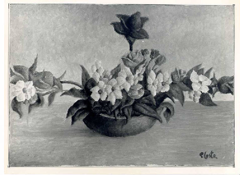 Opera pittorica che rappresenta al centro un vaso di fiori appoggiato ad un piano orizzontale. La stesura è veloce; frammentata. La luce è diffusa.