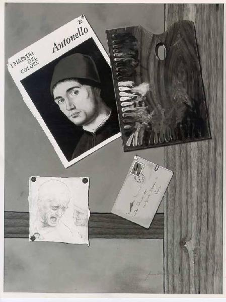 Opera pittrorica in cui il piano di fondo finge una finta parete a legno e intonaco su cui sono appesi una busta, la copertina del numero dei Maestri del colore dedicato ad Antonello Messina e una tavolozza da pittore.