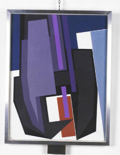 Opera pittorica caratterizzata da una composizione di forme geometriche irregolari e regolari piatte, disposte secondo una struttura verticale a occupare l'intero spazio a disposizione. Colore: viola, bianco, blu, arancio piatto. La stesura è uniforme.