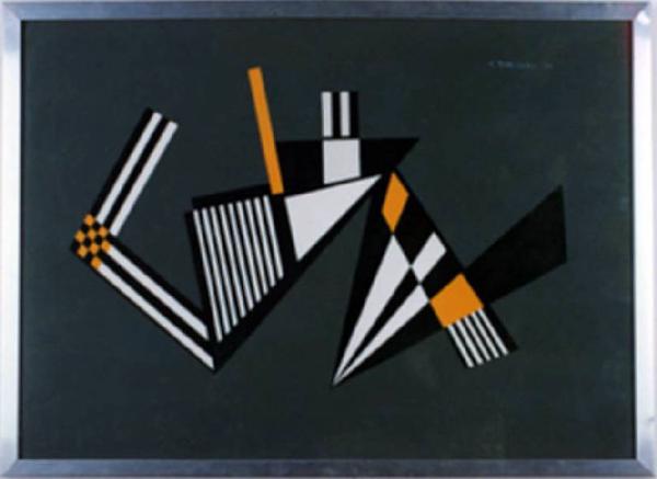 Opera pittorica cartterizzata da uno sviluppo di forme geometriche nitide e regolari secondo una struttura aperta orizzontale. Colore: cartoncino verde scuro e figure nere, bianche e gialle.
