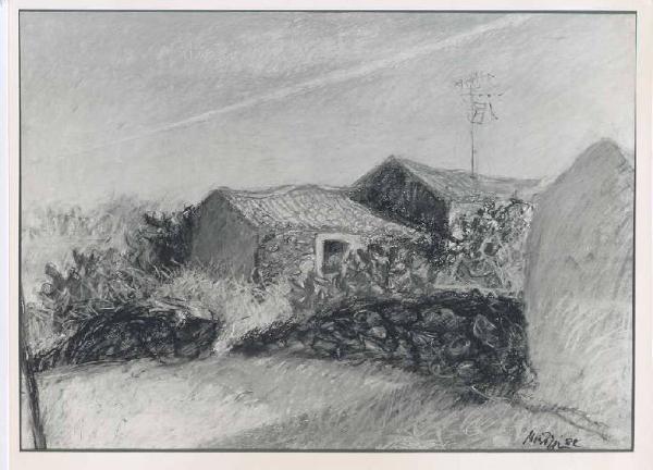 Opera pittorica che rappresenta al centro, immerse nella campagna, un fienile e una casa ad un piano. In primo piano a destra covone di fieno. La stesura è veloce. La luce è diffusa.