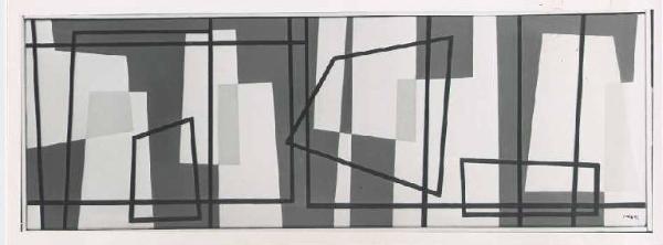 Opera pittorica costituita da una composizione di figure geometriche regolari a colore piatto, chiare e scure, piene e vuote, affiancate e sovrapposte secondo un andamento orizzontale.\nColore: verde, rosso, azzurro e nero.; piatto. La stesura è sottile; uniforme; piatta. La struttura è statica.