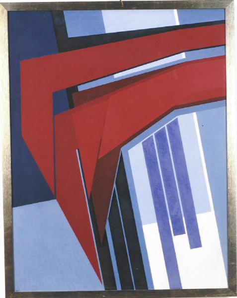 Opera pittorica costituita da una composizione di figure geometriche regolari e irregolari disposte secondo un andamento dinamico che procede dal margine destro verso quello sinistro. Il colore è cromatico; caldo (rosso); freddo (azzurro); piatto. La stesura è uniforme. La luce è diffusa.