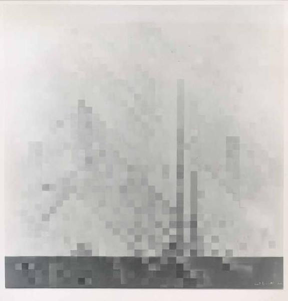 Opera pittorica in cui i palazzi illuminati di una metropoli sono rappresentati attraverso forme geometriche regolari (quadrati) disposte secondo andamenti verticali e orizzontali, differenziate per colore e grado di luminosità. Il colore è tonale; freddo; sfumato. La stesura è sottile. La struttura è statica. La luce è contrastata.
