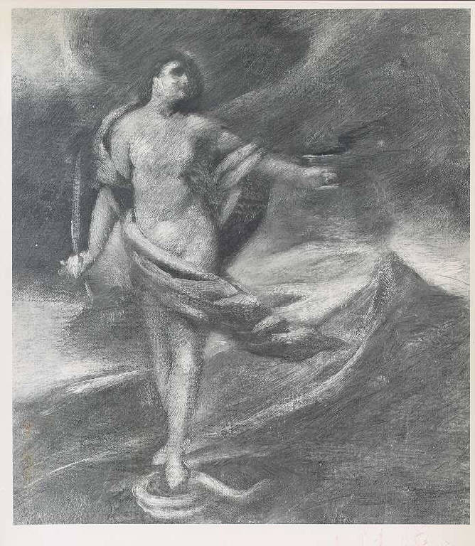 Opera pittorica che rappresenta in primo piano a sinistra una grande figura femminile mitologica nuda con drappo mosso dal vento. In secondo piano si apre un ampio paesaggio naturale notturno visto dall'alto. Il colore è tonale; caldo; sfumato. La stesura è spessa; veloce. La struttura è statica.\nLa luce è contrastata e laterale.