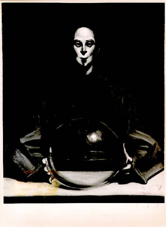 Opera che rappresenta in primo piano un uomo seduto e frontale che sta bevendo con una lunga cannuccia da una grande sfera di cristallo sorretta lateralmente con le mani. Il colore è tonale; caldo; sfumato. L a stesura è sottile; uniforme. La struttura è statica. La luce è frontale; contrastata.