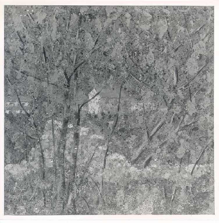 Opera pittorica con in primo piano alberi e vegetazione realizzati con un segno-colore libero e quasi informale. In secondo piano si intravedono case di campagna. La stesura è veloce; nervosa; frammentata, materica con incisioni con il manico del pennello e pettine. La struttura è statica. La luce è laterale; contrastata.
