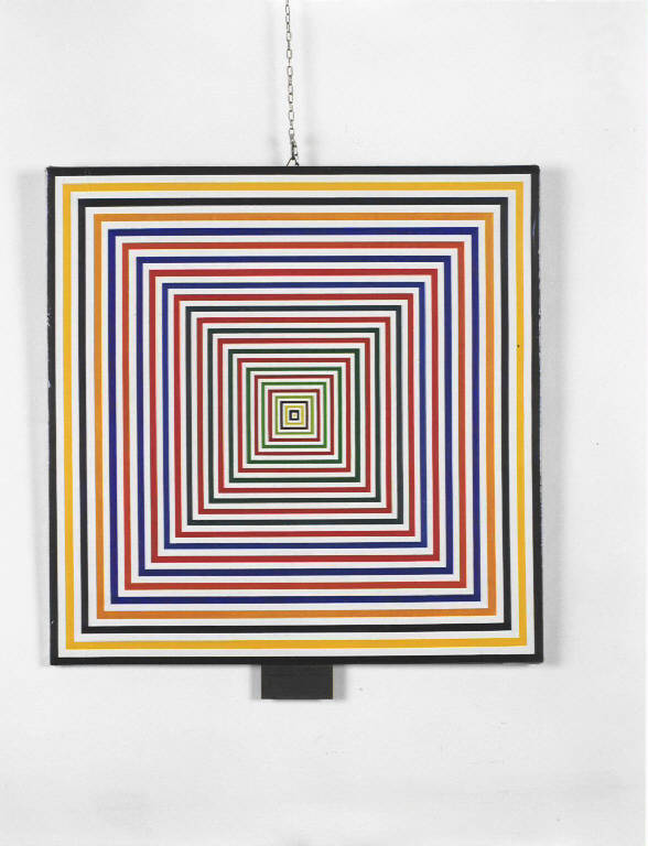Opera pittorica caratterizata da una composizione di quadrati concentrici che determinano un effetto ottico di profondità e di movimento.\nIl colore è piatto; caldo. La stesura è sottile; uniforme. La struttura è dinamica.