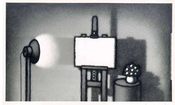 Opera pittorica che rappresenta una tela ancora bianca appoggiata ad un cavalletto collocato al centro della stanza. La tela è violentemente illuminata da una lampada posta a sinistra, mentre e destra un vaso di fiori è appoggiato ad un tavolino rotondo. Il colore è tonale; caldo; sfumato.\nLa stesura è uniforme; sottile. La struttura è dinamica. La luce è laterale, contrastata.