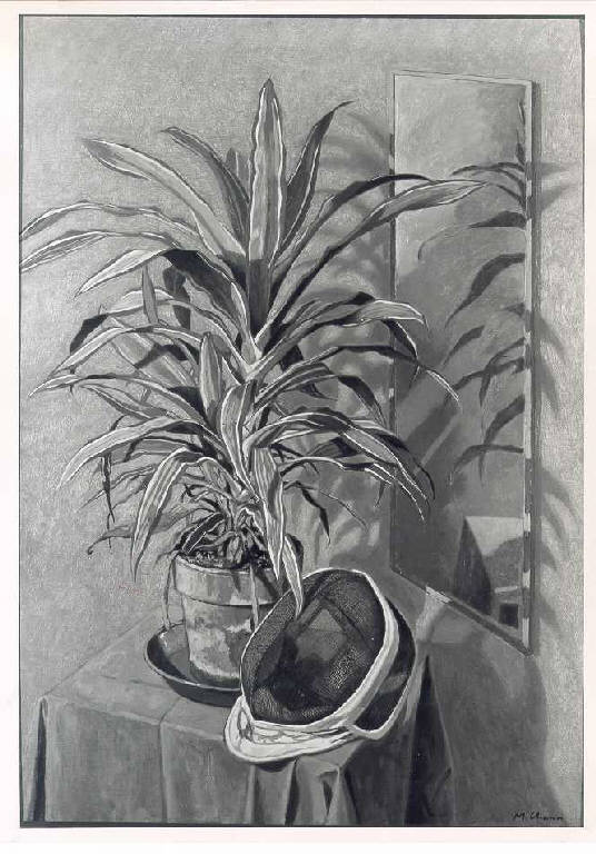 Opera pittorica che rappresenta su un tavolino coperto da una tovaglia una pianta e una maschera da scherma. A destra uno specchio appeso a parete riflette in parte la pianta e il tavolo. Il colore è tonale; caldo; sfumato.\nLa stesura è uniforme. La struttura è statica. La luce è laterale; contrastata.