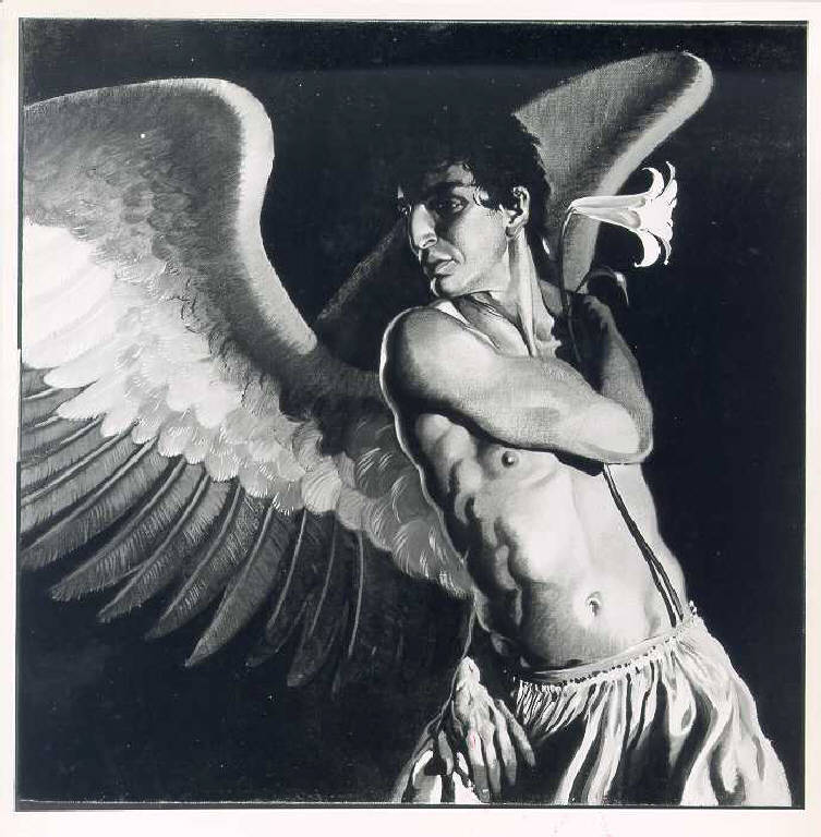 Opera pitttorica che rappresenta in primo piano un personaggio maschile con due grandi ali, un giglio nella mano destra e il volto ritrattistico. Il busto ruota su se stesso mostrando tuttavia evidenti errori anatomici. Il fondo è scuro e uniforme. La luce è fortemente contrastata. Il colore è tonale; freddo; sfumato. La stesura è uniforme e sottile. La struttura è dinamica.\nLa luce è laterale, contrastata.